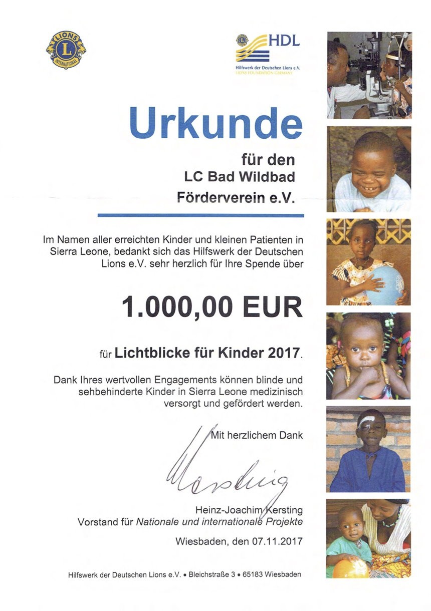 Unabhängig von regionalen Maßnahmen wirkt der LIONS CLUB Bad Wildbad bei internationalen Programmen mit. Im Rahmen eines weltweiten LIONS - Programms konnte 7 Millionen Menschen das Augenlicht wiedergegeben werden, 20 Millionen wurden vor der sicheren Erblindung gerettet. LIONS half vielen Millionen Menschen durch den Bau von Kliniken, besonders in den sogenannten Entwicklungsländern, zu besserer medizinischer Versorgung und zu augenmedizinisch ausgebildetem Personal.