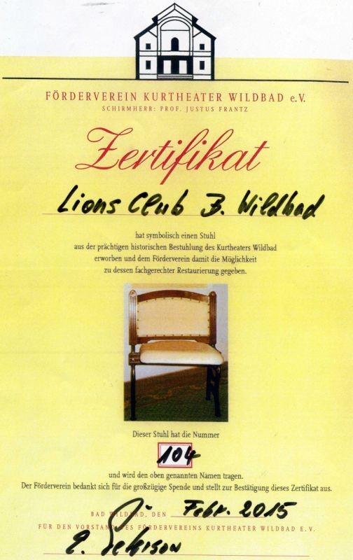 Die Förderung kultureller Belange gehört ebenfalls zu den Aufgaben des LIONS CLUBS. Am 7. Februar 2015 übernahmen wir durch eine Spende die Patenschaft für einen Stuhl des historischen Kurtheaters Bad Wildbad.