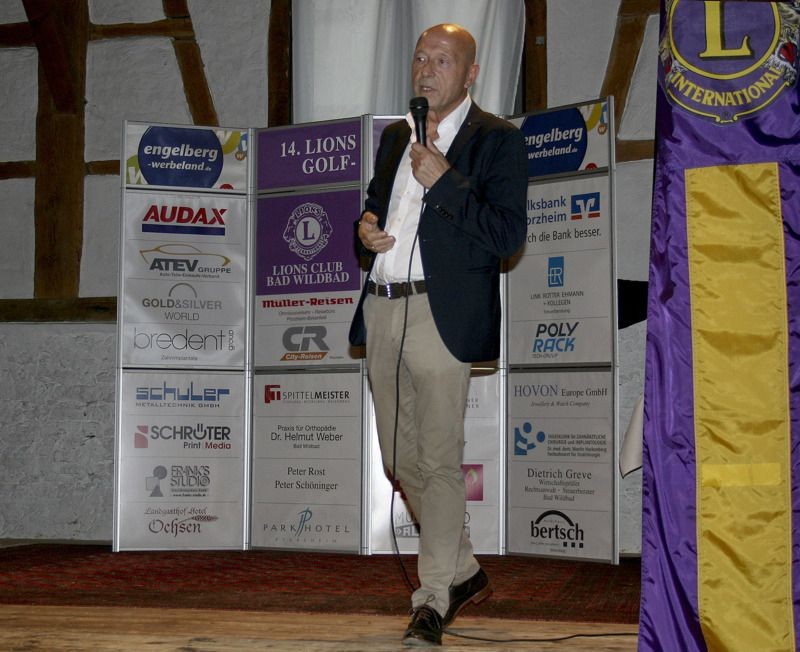 Der Lions-Präsident des Jahres 2014 / 15, Ekkehard Haase, begrüßte die Turnierteilnehmer am Abend beim Bankett und wies auf die Bedeutung von Lions hin. Lions Clubs International sei die weltweit größte nichtstaatliche Hilfsorganisation mit 1,2 Millionen Mitgliedern in über 200 Nationen. Nach Recherchen der New York Times ist Lions auch die am effektivsten arbeitende Organisation, die noch vor der UNESCO und der UNICEF rangiert. Lions hat zwei Beobachtersitze in der UNO und ist in deren Zentralen in Wien und Genf vertreten. Zum Abschluss dankte Ekkehard Haase allen Teilnehmern und Sponsoren für die Unterstützung des Lions Clubs Bad Wildbad, dem Golfclub Johannesthal zusammen mit den Mitarbeiterinnen im Sekretariat, die zum Gelingen der Veranstaltung beigetragen haben sowie Clubwirt Oliver Ruedel für die Halfway-Verpflegung und das schmackhafte Menü am Abend.