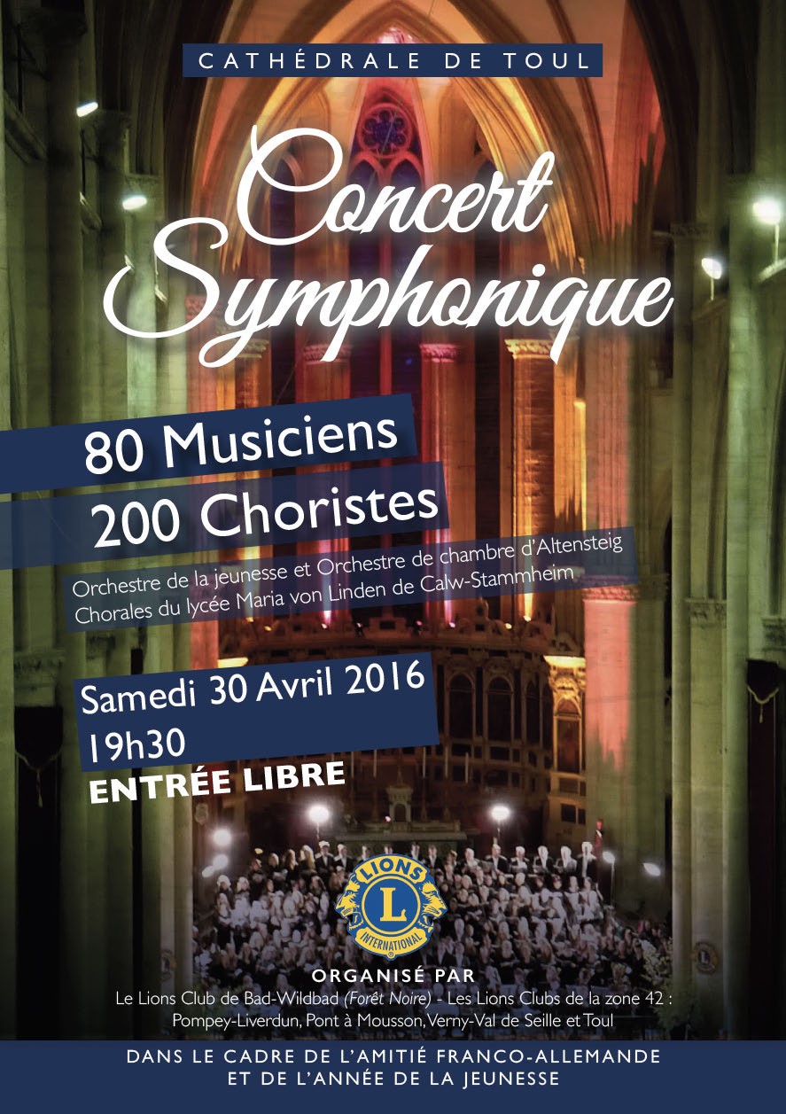 Die Erkenntnis, dass Völker nicht durch Gewalt, sondern nur durch ein friedliches Miteinander gewinnen können, hat nach einer Reihe von Kriegen auf europäischem Boden zur deutsch-französischen Freundschaft geführt. 100 Jahre nach Beginn des folgenschweren 1. Weltkrieges organisierte der LIONS CLUB Bad Wildbad gemeinsam mit mehreren französischen Lions Clubs ein Konzert in der geschichtsträchtigen Kathedrale von Toul/Frankreich.