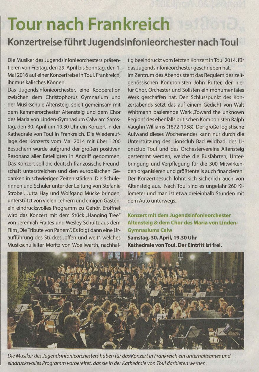Für nahezu 300 junge Musiker und ihre Begleiter wurde erneut durch den LIONS CLUB Bad Wildbad die Fahrt nach Toul organisiert und finanziert.