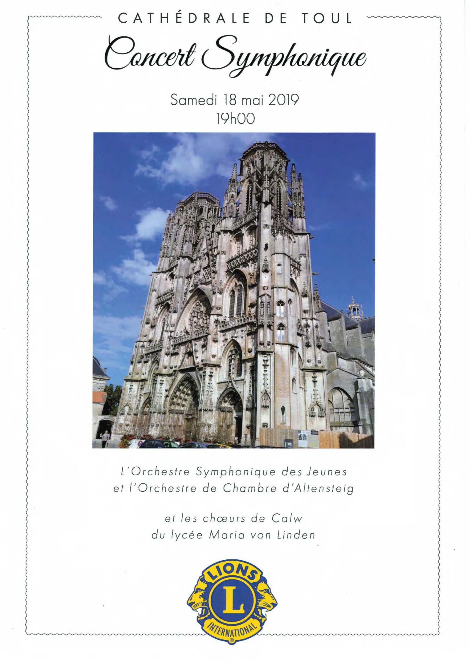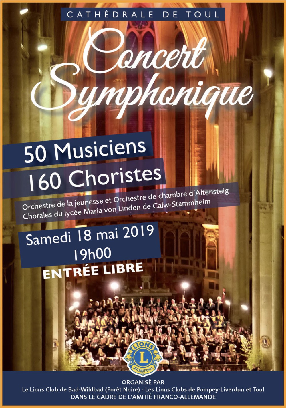 Die Erkenntnis, dass Völker nicht durch Gewalt, sondern nur durch ein friedliches Miteinander gewinnen können, hat nach einer Reihe von Kriegen auf europäischem Boden zur deutsch-französischen Freundschaft geführt. 100 Jahre nach Beginn des folgenschweren Ersten Weltkrieges organisierte der LIONS CLUB Bad Wildbad gemeinsam mit mehreren französischen Lions Clubs ein Konzert des Jugendsymphonieorchesters Altensteig und dem Chor des Maria-von-Linden-Gymnasiums Calw in der geschichtsträchtigen Kathedrale von Toul/Frankreich.