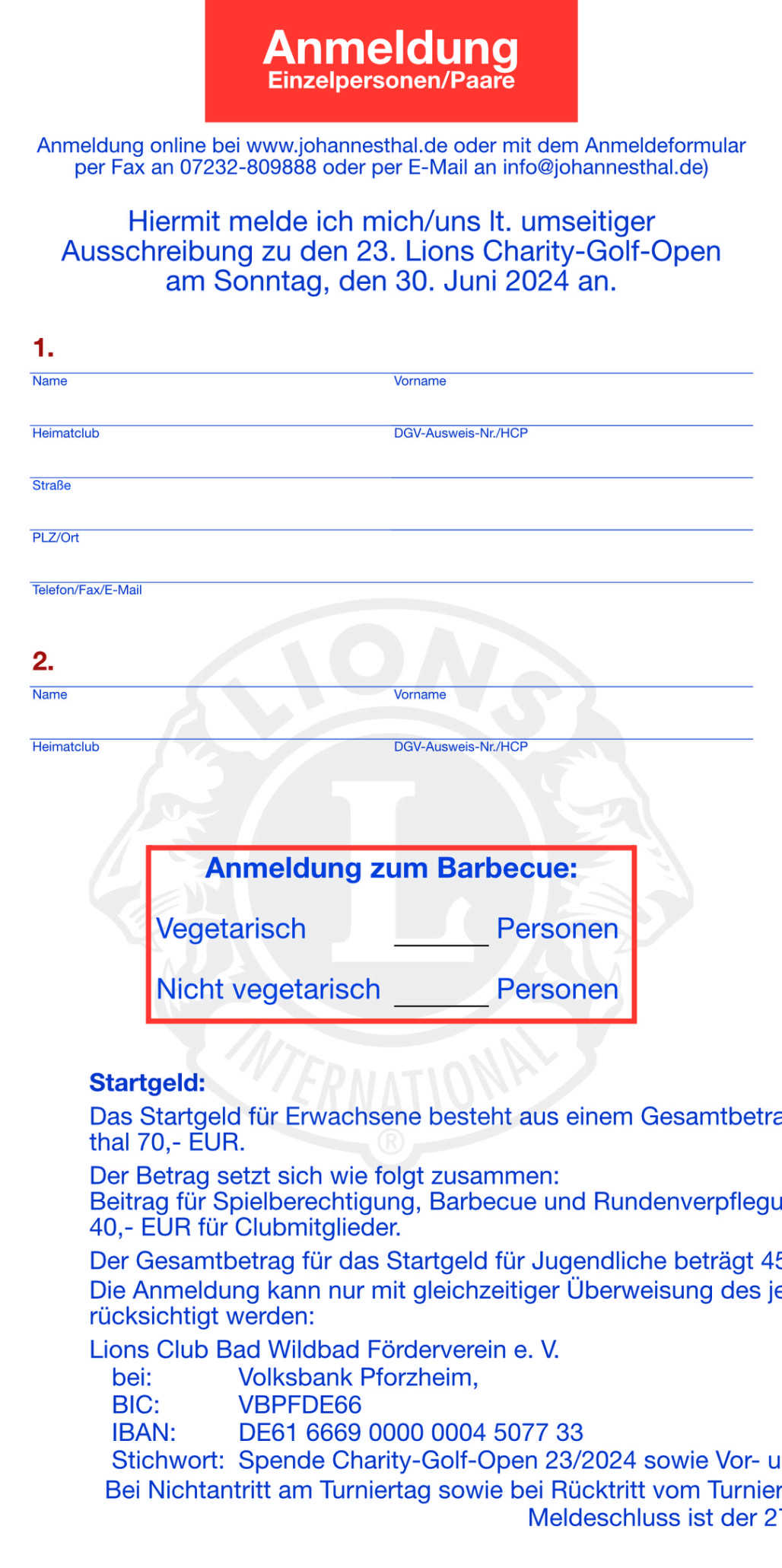 Die Anmeldung kann nur mit gleichzeitiger Überweisung des Gesamtbetrages auf das angegebene Spendenkonto berücksichtigt werden. Mitglieder des Golfclubs Johannesthal können mit einem reduzierten Nenngeld starten.