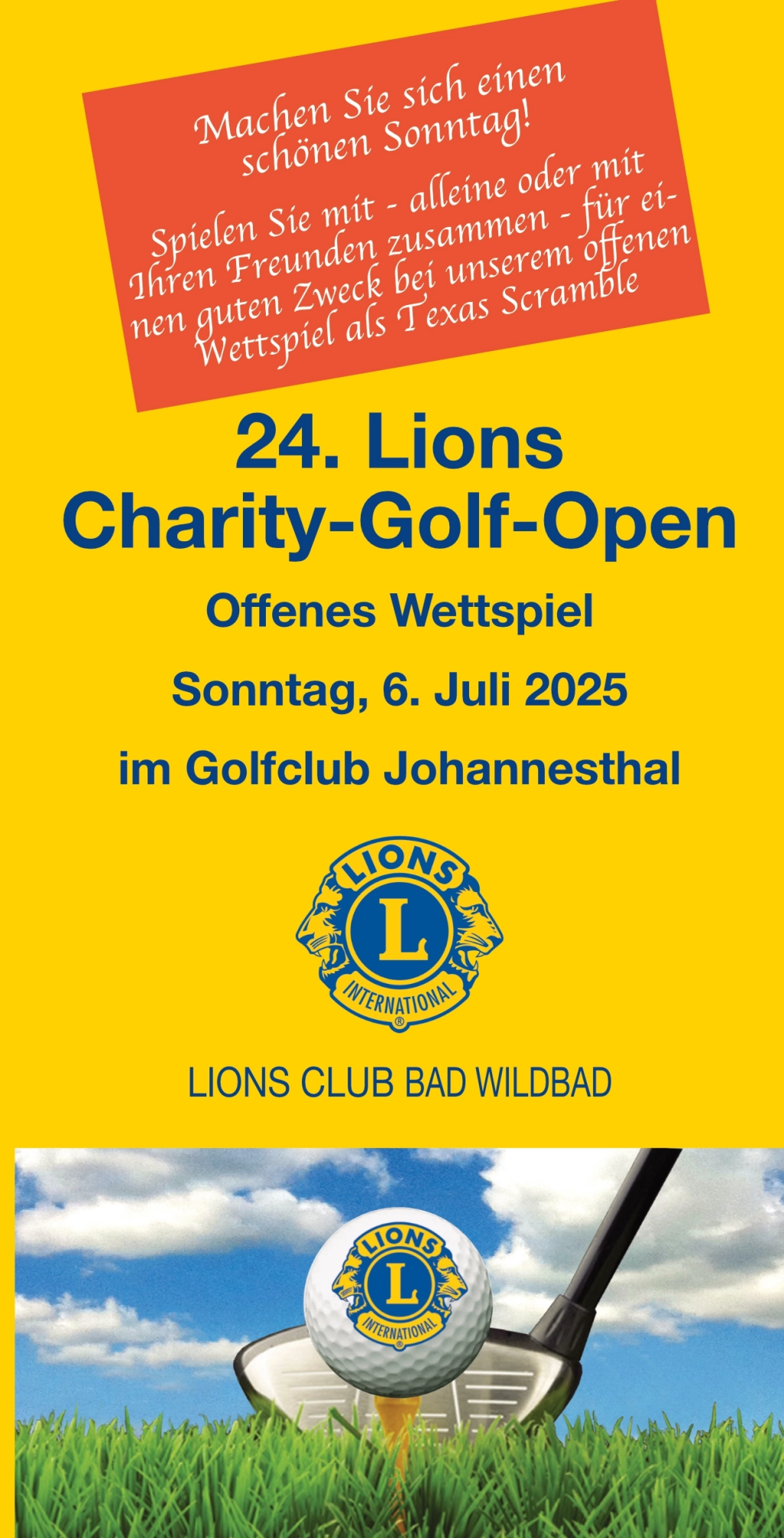 Der Förderverein des Lions Clubs Bad Wildbad veranstaltet am Sonntag, den 6. Juli 2025 seine 24. Lions-Charity-Golf-Open auf der Anlage des Golfclubs Johannesthal bei Königsbach.