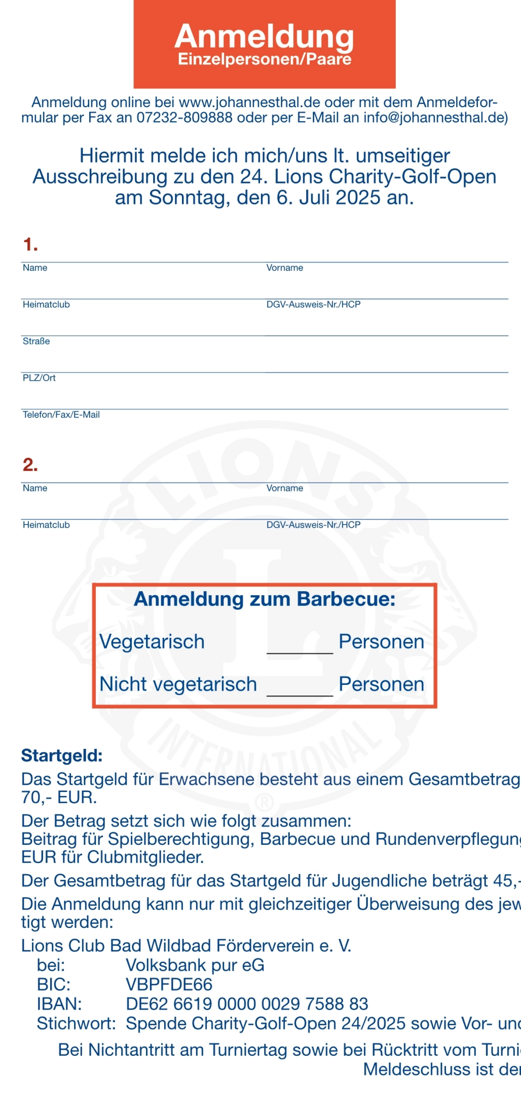Die Anmeldung kann nur mit gleichzeitiger Überweisung des Gesamtbetrages auf das angegebene Spendenkonto berücksichtigt werden. Mitglieder des Golfclubs Johannesthal können mit einem reduzierten Nenngeld starten.