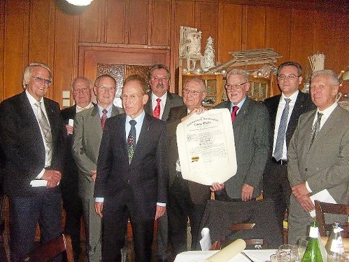 Aufstellen zum Gruppenbild: Peter Schöniger, Eckard Seyfried, Jürgen Jungnickel, Dietrich Greve, Präsident Martin Jost, Horst Günther, Helmut Weber, René Baum und Herbert Krause (von links). Es fehlen das Gründungsmitglied Wolfgang Haug und Horst Hägele.
