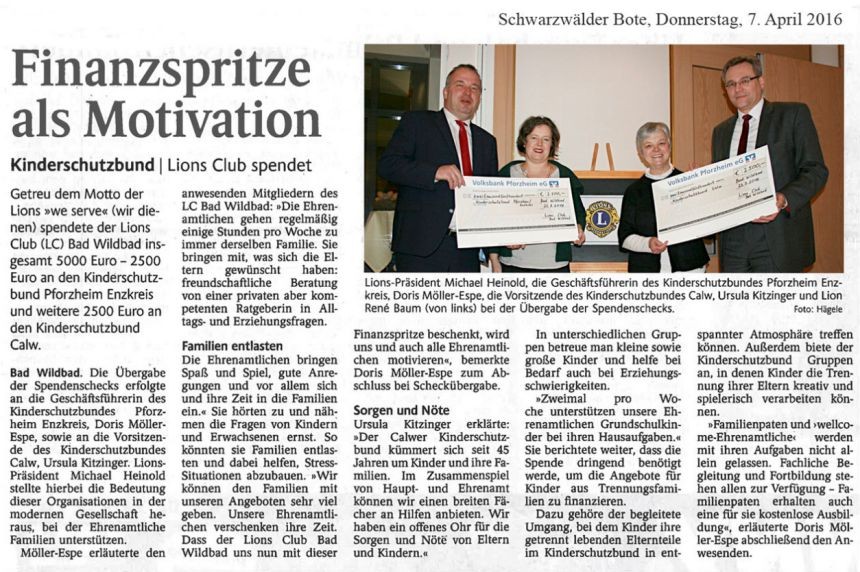 Finanzspritze als Motivation - Lions unterstützen Kinderschutzbund