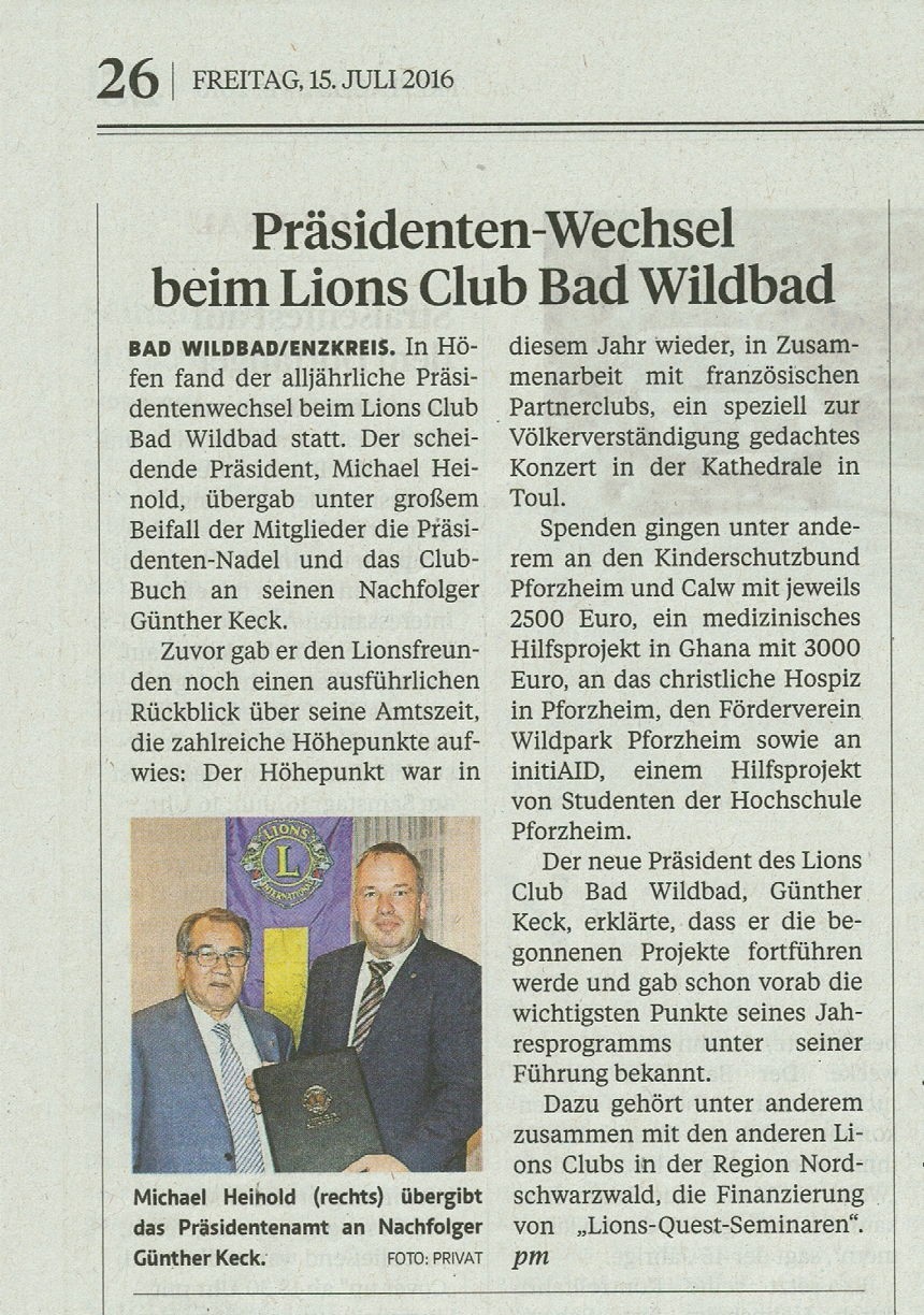 Lions Club Bad Wildbad - Multidistrikt: 111, Distrikt: Süd-Nord, Region: II, Zone: 5