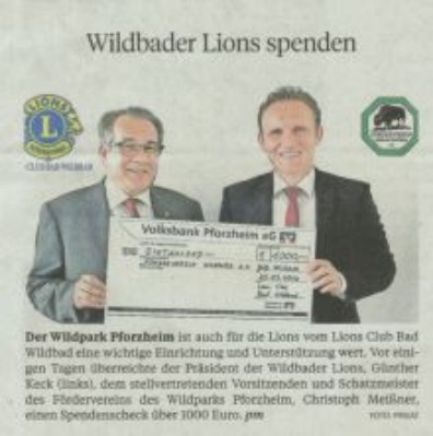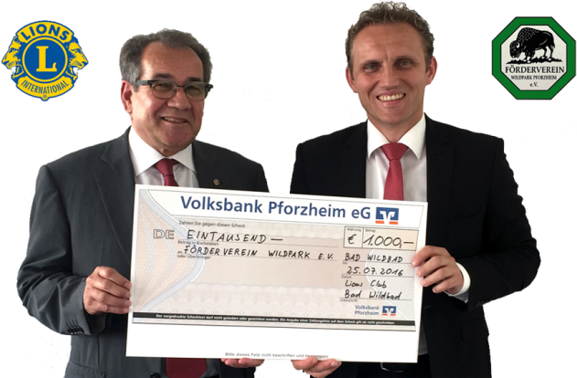 Der Wildpark Pforzheim ist auch für die Lions vom Lions Club Bad Wildbad eine wichtige Einrichtung und Unterstützung wert. Vor einigen Tagen überreichte der Präsident der Wildbader Lions, Günther Keck (links), dem stellvertretenden Vorsitzenden und Schatzmeister des Fördervereins des Wildparks Pforzheim, Christoph Meißner, einen Spendenscheck über 1000 Euro. pm