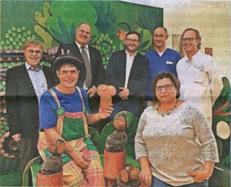 Es war ein Golfturnier, das viel Gutes für den Verein Springmaus und seinen Klinik-Clown Dodo abgeworfen hat: Der Lions Club Wildbad hat jetzt den Erlös seiner Benefizveranstaltung vom Sommer im Helios Klinikum Pforzheim übergeben. Insgesamt 2500 Euro hatten Horst Hägele und Christoph Bühler vom Lions-Club Bad Wildbad (hinten von links) für Springmaus-Vorsitzenden Martin Steiner und die Kinderklinikärzte Walter Mihatsch und Thomas Ringle im Gepäck. Sehr zur Freude von Clown Dodo und Springmausschatzmeisterin Simone Corda (vorne). Dodo heitert einmal wöchentlich junge Patienten der Kinderklinik auf. gk