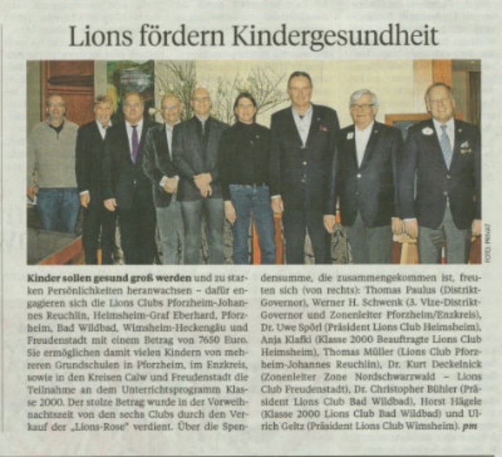 Kinder sollen gesund groß werden und zu starken Persönlichkeiten heranwachsen - dafür engagieren sich die Lions Clubs Pforzheim-Johannes Reuchlin, Heimsheim-Graf Eberhard, Pforzheim, Bad Wildbad, Wimsheim-Heckengäu und Freudenstadt mit einem Betrag von 7650 Euro.