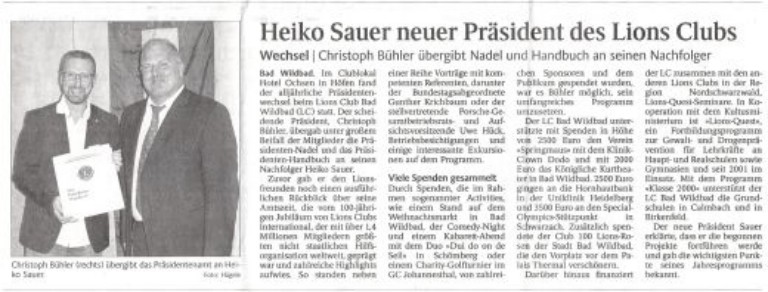 Horst Hägele - Bad Wildbad. Im Clublokal Hotel Ochsen in Höfen fand der alljährliche Präsidentenwechsel beim Lions Club Bad Wildbad (LC) statt.