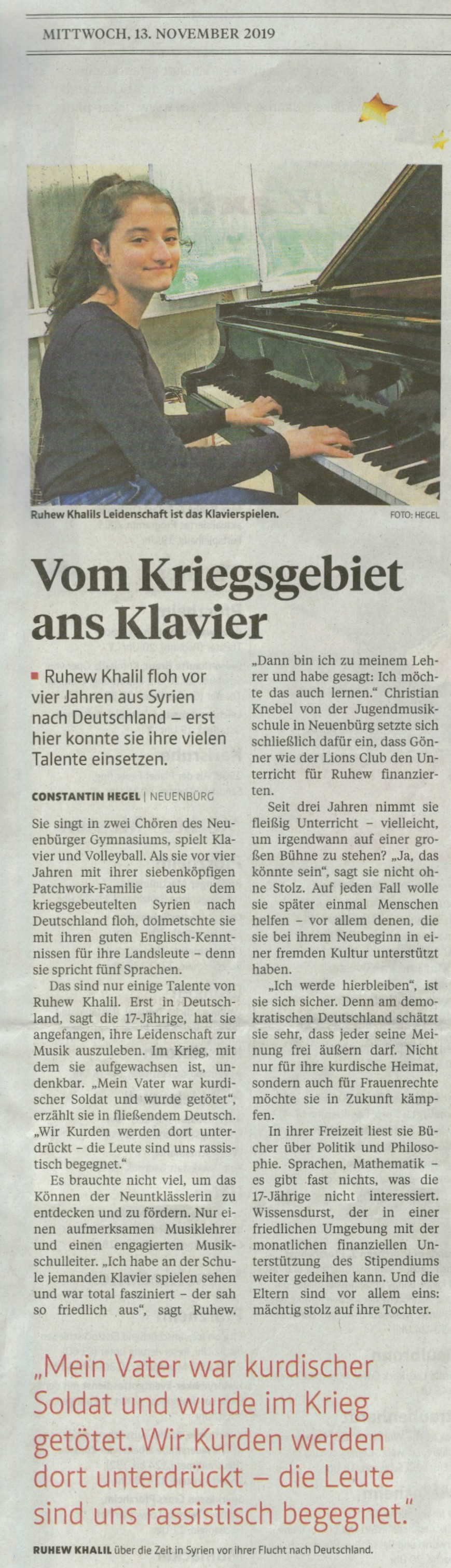 Das sind nur einige Talente von Ruhew Khalil. Erst in Deutschland, sagt die 17-Jährige, hat sie angefangen, ihre Leidenschaft zur Musik auszuleben. Im Krieg, mit dem sie aufgewachsen ist, undenkbar. „Mein Vater war kurdischer Soldat und wurde getötet“, erzählt sie in fließendem Deutsch. „Wir Kurden werden dort unterdrückt - die Leute sind uns rasistisch begegnet.“