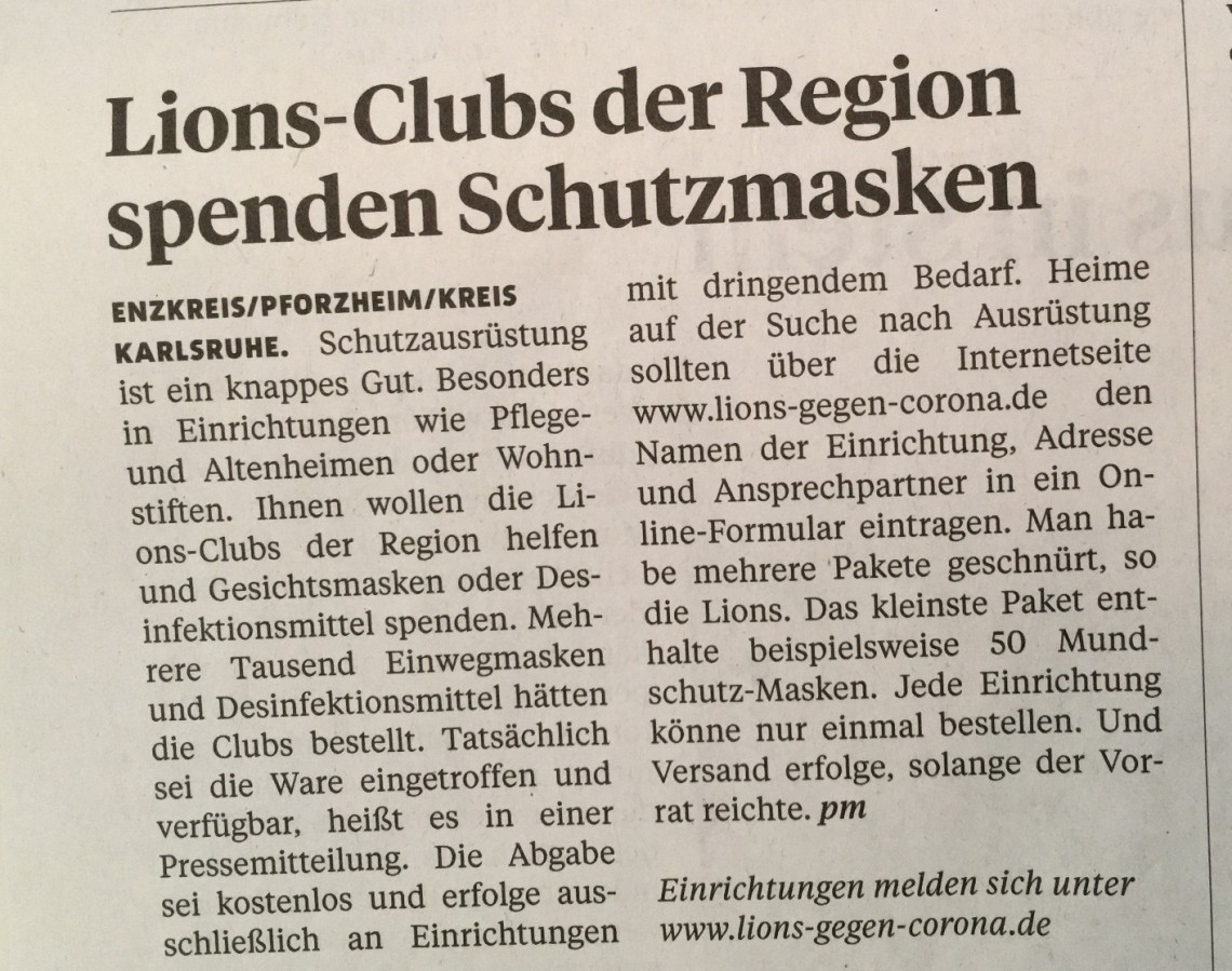 ENZKREIS/PFORZHEIM/KREIS KARLSRUHE. Schutzausrüstung ist ein knappes Gut. Besonders in Einrichtungen wie Pflege und Altenheimen oder Wohnstiften. Ihnen wollen die Lions-Clubs der Region helfen und Gesichtsmasken oder Desinfektionsmittel spenden. Mehrere Tausend Einwegmasken und Desinfektionsmittel hätten
