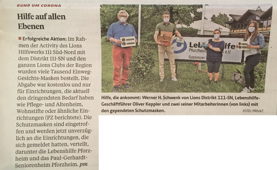 Erfolgreiche Aktion: Im Rahmen der Activity des Lions Hilfswerks 111 Süd-Nord mit dem Distrikt 111-SN und den ganzen Lions Clubs der Region wurden viele Tausend Einweg-Gesichtsmasken bestellt. Die Abgabe war kostenlos und nur für Einrichtungen, die aktuell den dringendsten Bedarf haben wie Pflege- und Altenheim, Wohnstifte oder ähnliche Einrichtungen (PZ berichtete). Die Schutzmasken sind eingetroffen und werden jetzt unverzüglich an die Einrichtungen, die sich gemeldet hatten, verteilt, darunter die Lebenshilfe Pforzheim und das Paul-Gerhardt-Seniorenheim Pforzheim. pm