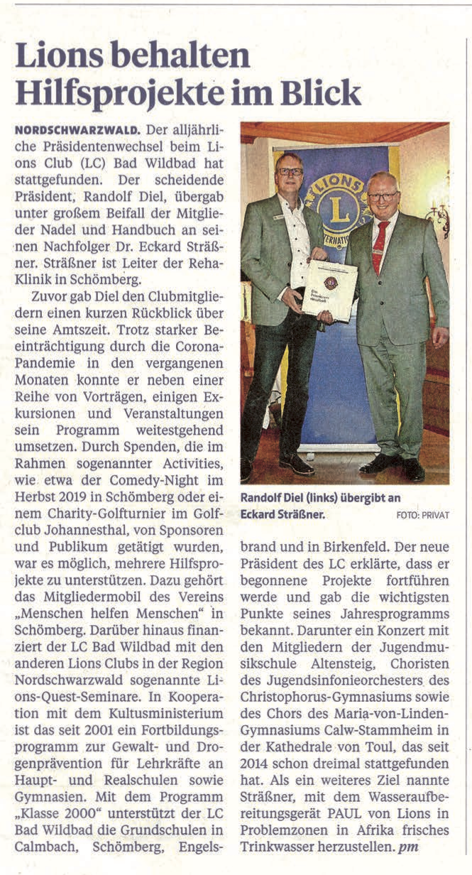 Zuvor gab Diel den Clubmitgliedern einen kurzen Rückblick über seine Amtszeit. Trotz starker Beeinträchtigung durch die Corona- Pandemie in den vergangenen Monaten konnte er neben einer Reihe von Vorträgen, einigen Exkursionen und Veranstaltungen sein Programm weitestgehend umsetzen. Durch Spenden, die im Rahmen sogenannter Activities, wie etwa der Comedy-Night im Herbst 2019 in Schömberg oder einem Charity-Golfturnier im Golfclub Johannesthal, von Sponsoren und Publikum getätigt wurden, war es möglich, mehrere Hilfsprojekte zu unterstützen. Dazu gehört das Mitgliedermobil des Vereins „Menschen helfen Menschen“ in Schömberg. Darüber hinaus finanziert der LC Bad Wildbad mit den anderen Lions Clubs in der Region Nordschwarzwald sogenannte Lions-Quest-Seminare. In Kooperation mit dem Kultusministerium ist das seit 2001 ein Fortbildungsprogramm zur Gewalt- und Drogenprävention für Lehrkräfte an Haupt- und Realschulen sowie Gymnasien. Mit dem Programm „Klasse 2000“ unterstützt der LC Bad Wildbad die Grundschulen in Calmbach, Schömberg, Engelsbrand und in Birkenfeld. Der neue Präsident des LC erklärte, dass er begonnene Projekte fortführen werde und gab die wichtigsten Punkte seines Jahresprogramms bekannt. Darunter ein Konzert mit den Mitgliedern der Jugendmusikschule Altensteig, Choristen des Jugendsinfonieorchesters des Christophorus-Gymnasiums sowie des Chors des Maria-von-Linden-Gymnasiums Calw-Stammheim in der Kathedrale von Toul, das seit 2014 schon dreimal stattgefunden hat. Als ein weiteres Ziel nannte Sträßner, mit dem Wasseraufbereitungsgerät PAUL von Lions in Problemzonen in Afrika frisches Trinkwasser herzustellen, pm