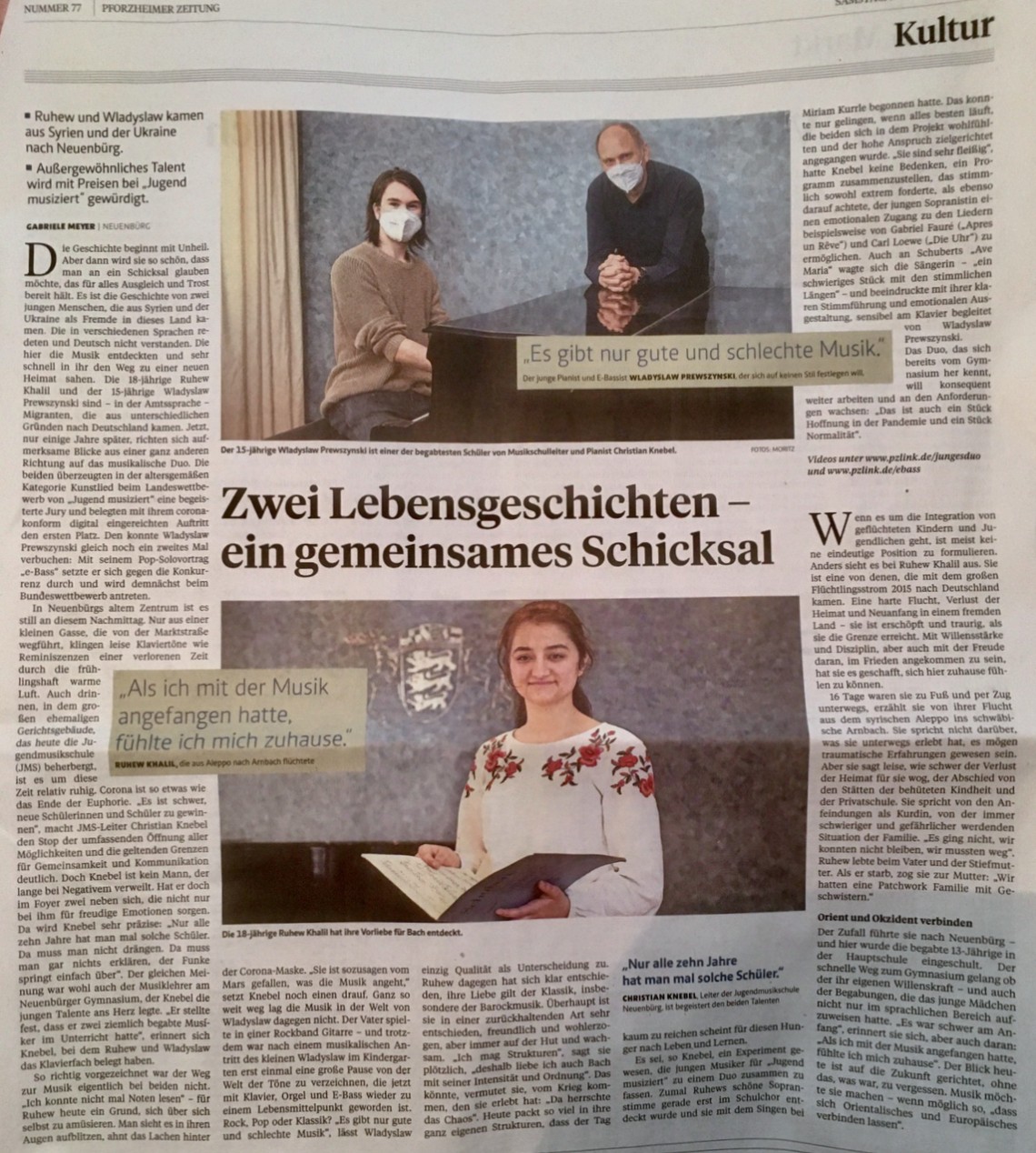 Neuenbürg. Die Geschichte beginnt mit Unheil. Aber dann wird sie so schön, dass man an ein Schicksal glauben möchte, das für alles Ausgleich und Trost bereit hält. Es ist die Geschichte von zwei jungen Menschen, die aus Syrien und der Ukraine als Fremde in dieses Land kamen. Die in verschiedenen Sprachen redeten und Deutsch nicht verstanden. Die hier die Musik entdeckten und sehr schnell in ihr den Weg zu einer neuen Heimat sahen. Die 18-jährige Ruhew Khalil und der 15-jährige Wladyslaw Prewszynski sind – in der Amtssprache – Migranten, die aus unterschiedlichen Gründen nach Deutschland kamen. Jetzt, nur einige Jahre später, richten sich aufmerksame Blicke aus einer ganz anderen Richtung auf das musikalische Duo. Die beiden überzeugten in der altersgemäßen Kategorie Kunstlied beim Landeswettbewerb von „Jugend musiziert“ eine begeisterte Jury und belegten mit ihrem coronakonform digital eingereichten Auftritt den ersten Platz. Den konnte Wladyslaw Prewszynski gleich noch ein zweites Mal verbuchen: Mit seinem Pop-Solovortrag „e-Bass“ setzte er sich gegen die Konkurrenz durch und wird demnächst beim Bundeswettbewerb antreten.