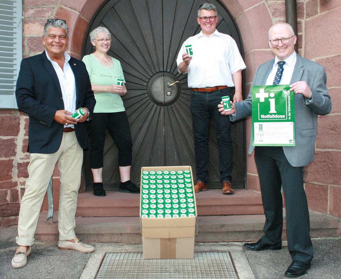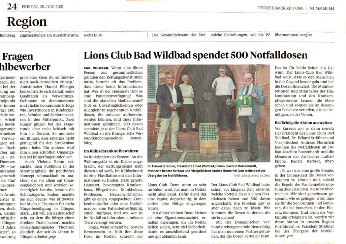 BAD WILDBAD. Wenn eine ältere Person aus gesundheitlichen Gründen den Rettungsdienst rufen muss, besteht oft das Problem, dass dieser keine Informationen hat. Wer ist der Hausarzt? Gibt es eine Patientenverfügung? Was sind die aktuellen Medikamente? Gibt es Unverträglichkeiten oder Allergien? In sogenannten Notfalldosen, die zu Hause aufbewahrt werden können, sind diese Informationen gebündelt. 500 davon spendete jetzt der Lions Club Bad Wildbad an die Evangelische Verbundkirchengemeinde Neuenbürg.