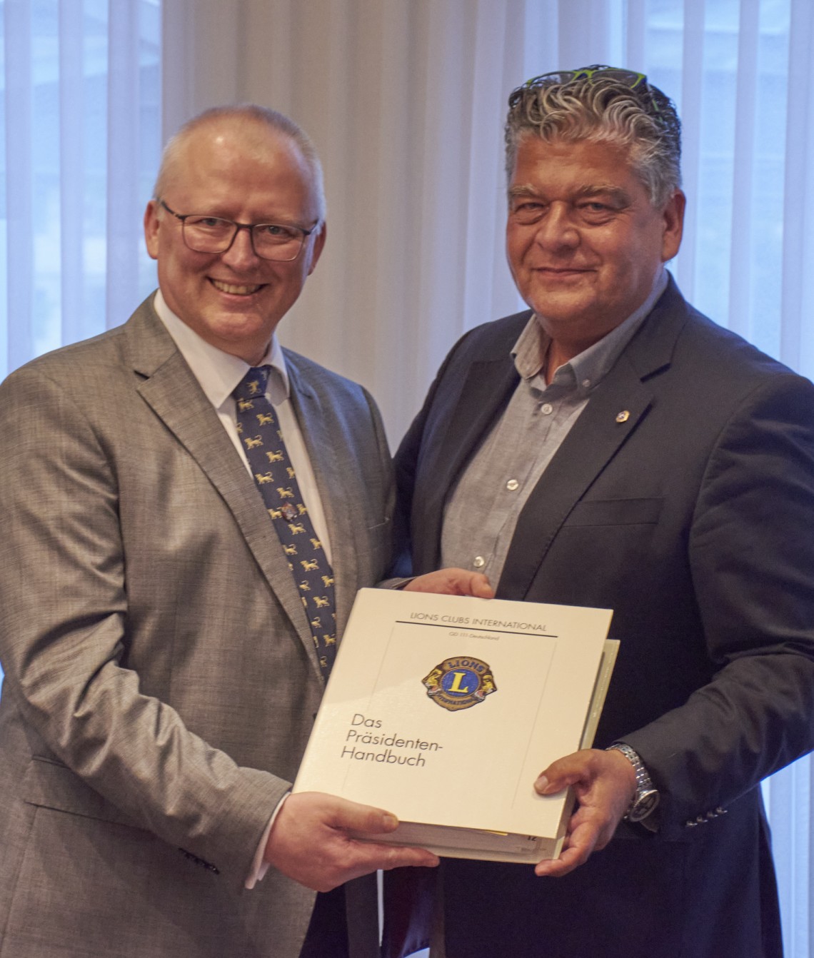 Eckard Sträßner (links) übergibt das Präsidentenhandbuch an Andreas Horntrich.