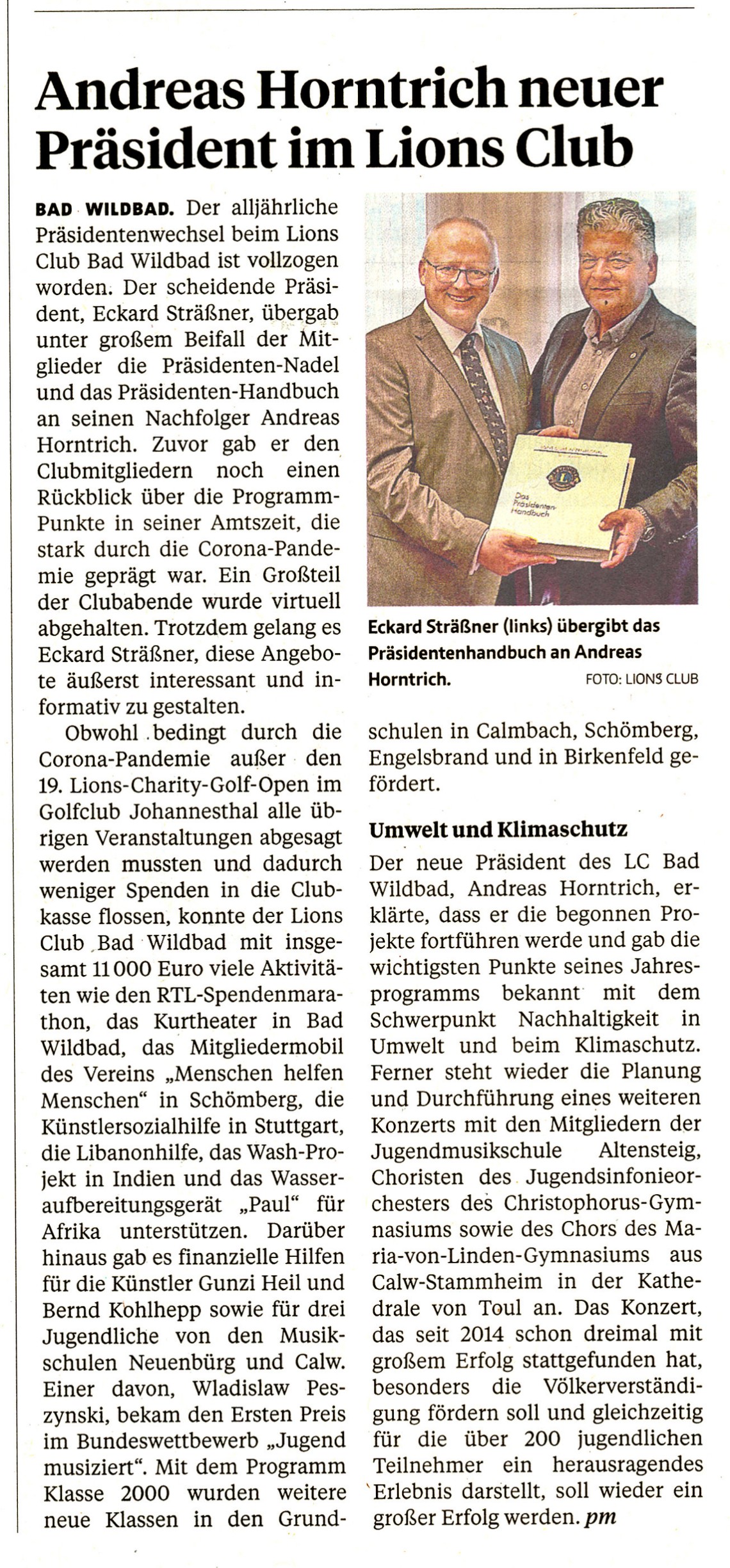 BAD WILDBAD. Der alljährliche Präsidentenwechsel beim Lions Club Bad Wildbad ist vollzogen worden. Der scheidende Präsident, Eckard Sträßner, übergab unter großem Beifall der Mitglieder die Präsidentennadel und das Präsidentenhandbuch an seinen Nachfolger Andreas Horntrich. Zuvor gab er den Clubmitgliedern noch einen Rückblick über die Programmpunkte in seiner Amtszeit, die stark durch die Coronapandemie geprägt war. Ein Großteil der Clubabende wurde virtuell abgehalten. Trotzdem gelang es Eckard Sträßner, diese Angebote äußerst interessant und informativ zu gestalten.
