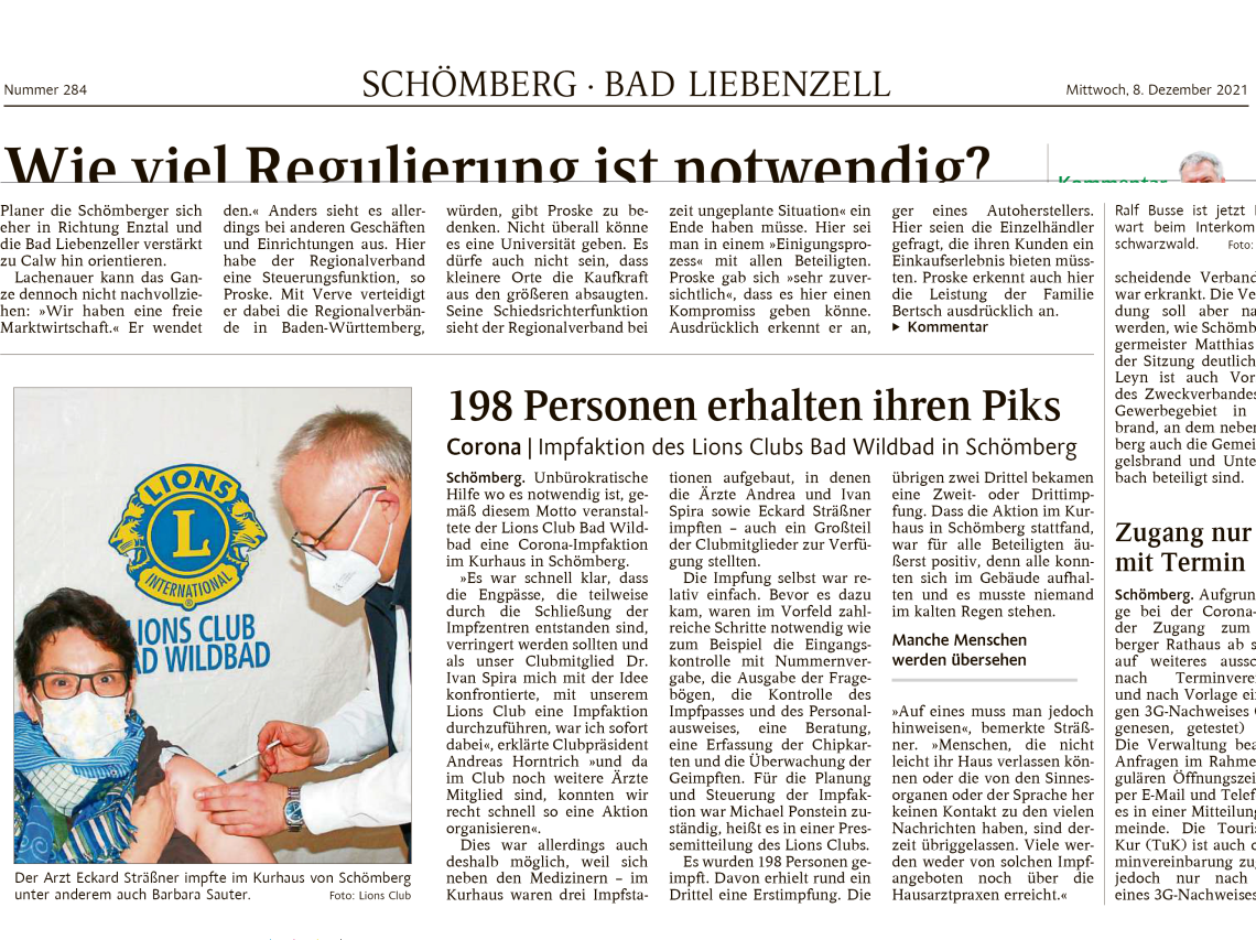 Schömberg. Unbürokratische Hilfe wo es notwendig ist, gemäß diesem Motto veranstaltete der Lions Club Bad Wildbad eine Corona-Impfaktion im Kurhaus in Schömberg.