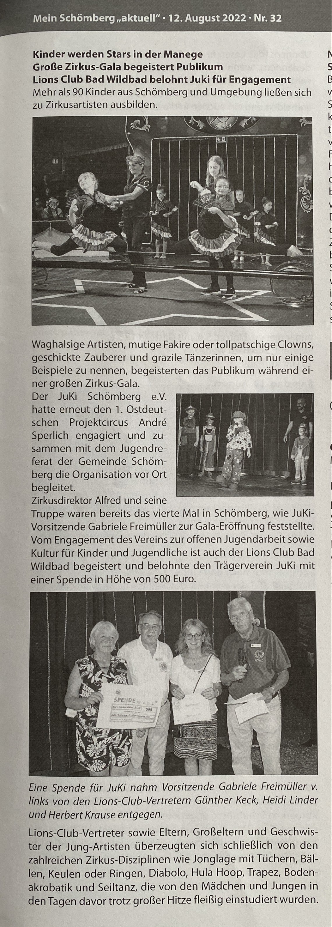 Zirkusdirektor Alfred und seine Truppe waren bereits das vierte Mal in Schömberg wie JuKi-Vorsitzende Gabriele Freimüller zur Gala-Eröffnung feststellte. Vom Engagement des Vereins zur offenen Jugendarbeit sowie Kultur für Kinder und Jugendliche ist auch der Lions Club Bad Wildbad begeistert und belohnte den Trägerverein JuKi mit einer Spende in Höhe von 500 Euro.