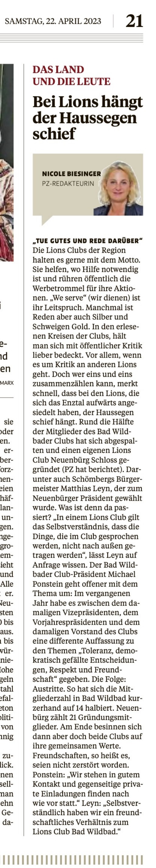 Manchmal ist Reden aber auch Silber und Schweigen Gold. In den erlesenen Kreisen der Clubs, hält man sich mit öffentlicher Kritik lieber bedeckt. Vor allem, wenn es um Kritik an anderen Lions geht. Doch wer eins und eins zusammenzählen kann, merkt schnell, dass bei den Lions, die sich das Enztal aufwärts angesiedelt haben, der Haussegen schief hängt. Rund die Hälfte der Mitglieder des Bad Wildbader Clubs hat sich abgespalten und einen eigenen Lions Club Neuenbürg Schloss gegründet (PZ hat berichtet). Darunter auch Schömbergs Bürgermeister Matthias Leyn, der zum Neuenbürger Präsident gewählt wurde.