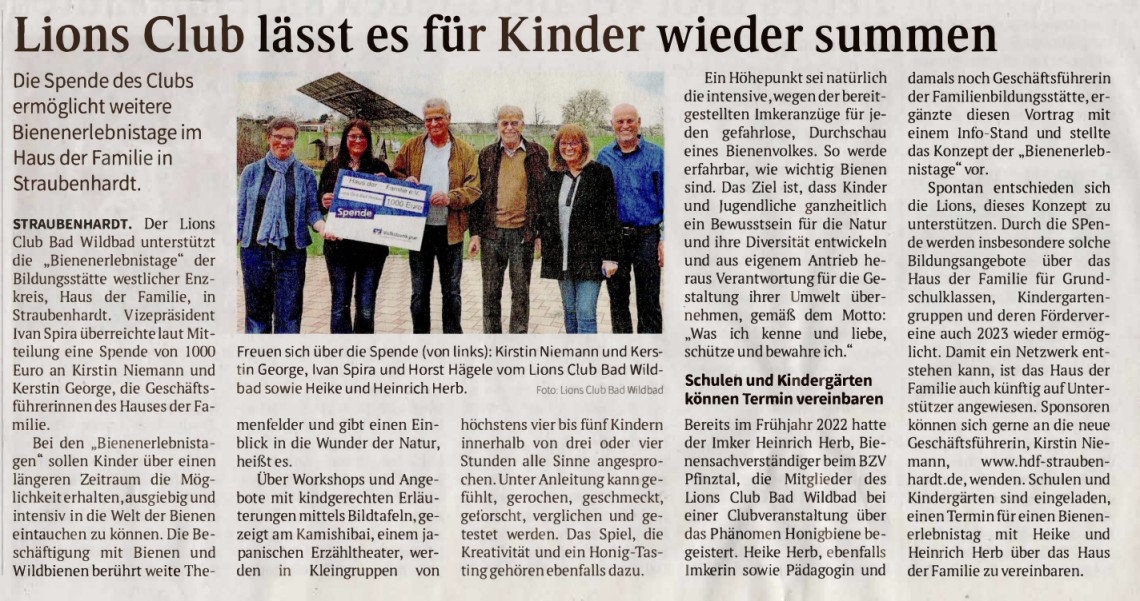 Spontan entschieden sich die Lions, dieses Konzept zu unterstützen. Durch die Spende werden insbesondere solche Bildungsangebote über das Haus der Familie für Grundschulklassen, Kindergartengruppen und deren Fördervereine auch 2023 wieder ermöglicht. Damit ein Netzwerk entstehen kann, ist das Haus der Familie auch künftig auf Unterstützer angewiesen. Sponsoren können sich gerne an die neue Geschäftsführerin, Kirstin Niemann www.hdf-straubenhardt.de wenden. Schulen und Kindergärten sind eingeladen, einen Termin für einen Bienenerlebnistag mit Heike und Heinrich Herb über das Haus der Familie zu vereinbaren.