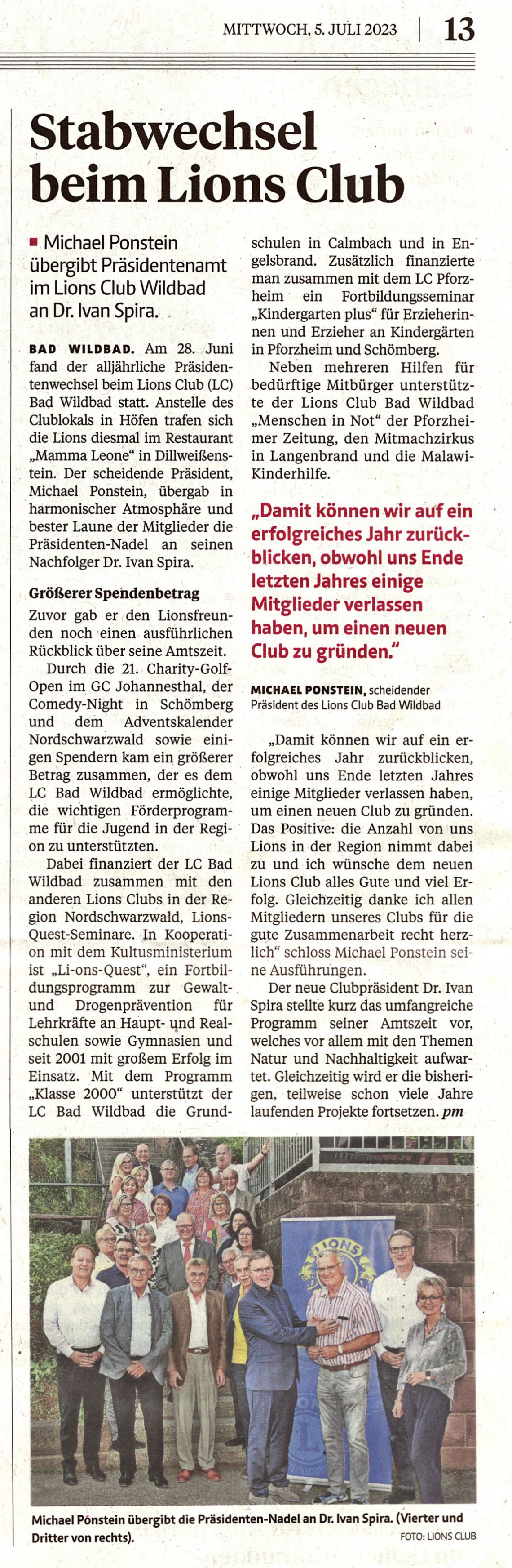 BAD WILDBAD. Am 28. Juni fand der alljährliche Präsidentenwechsel beim Lions Club (LC) Bad Wildbad statt. Anstelle des Clublokals in Höfen trafen sich die Lions diesmal im Restaurant „Mamma Leone" in Dillweißenstein. Der scheidende Präsident, Michael Ponstein, übergab in harmonischer Atmosphäre und bester Laune der Mitglieder die Präsidentennadel an seinen Nachfolger Dr. Ivan Spira.