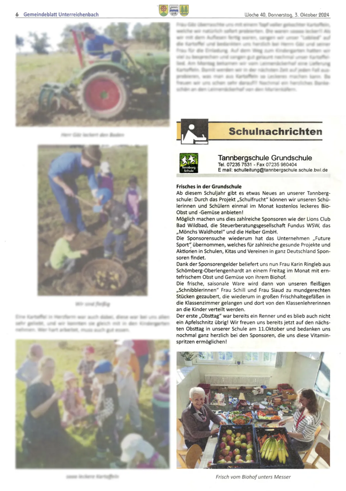 Dank der Sponsorengelder beliefert uns nun Frau Karin Ringleb aus Schömberg-Oberlengenhardt an einem Freitag im Monat mit erntefrischem Obst und Gemüse von ihrem Biohof.