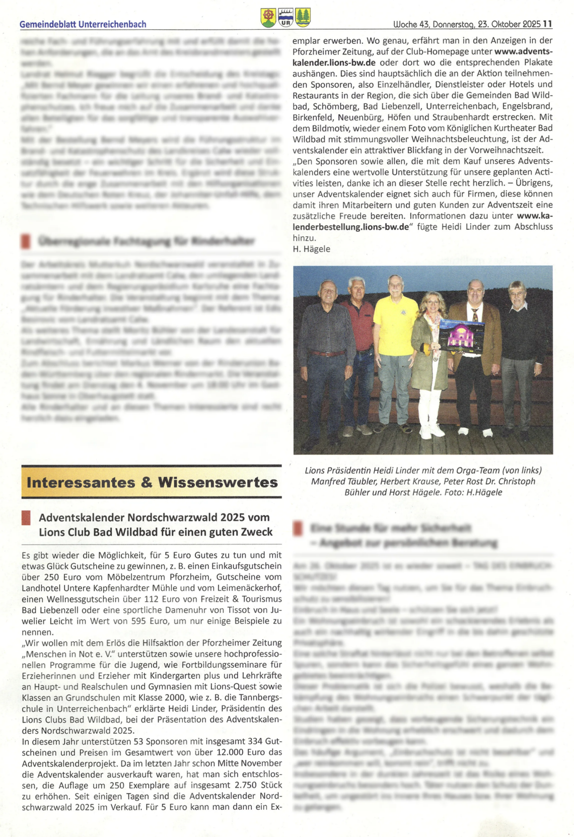 „Wir wollen mit dem Erlös die Hilfsaktion der Pforzheimer Zeitung „Menschen in Not e. V.“ unterstützen sowie unsere hochprofessionellen Programme für die Jugend, wie Fortbildungsseminare für Erzieherinnen und Erzieher mit Kindergarten plus und Lehrkräfte an Haupt- und Realschulen und Gymnasien mit Lions-Quest sowie Klassen an Grundschulen mit Klasse 2000, wie z . B. die Tannbergschule in Unterreichenbach“ erklärte Heidi Linder, Präsidentin des Lions Clubs Bad Wildbad, bei der Präsentation des Adventskalenders Nordschwarzwald 2025.