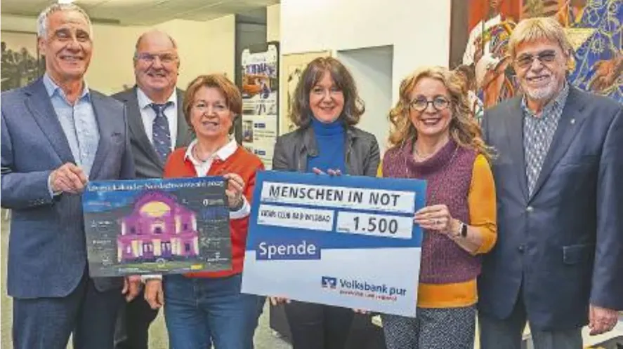 Den Vorsitzenden von „Menschen in Not“, Thomas Satinsky (links) und Susanne Knöller (Dritte von rechts), überreichen Dr. Christoph Bühler, Eva Greve, Clubpräsidentin Heidi Linder und Horst Hägele vom Lions Club Bad Wildbad (von links) den symbolischen Spendenscheck in Höhe von 1500 Euro.