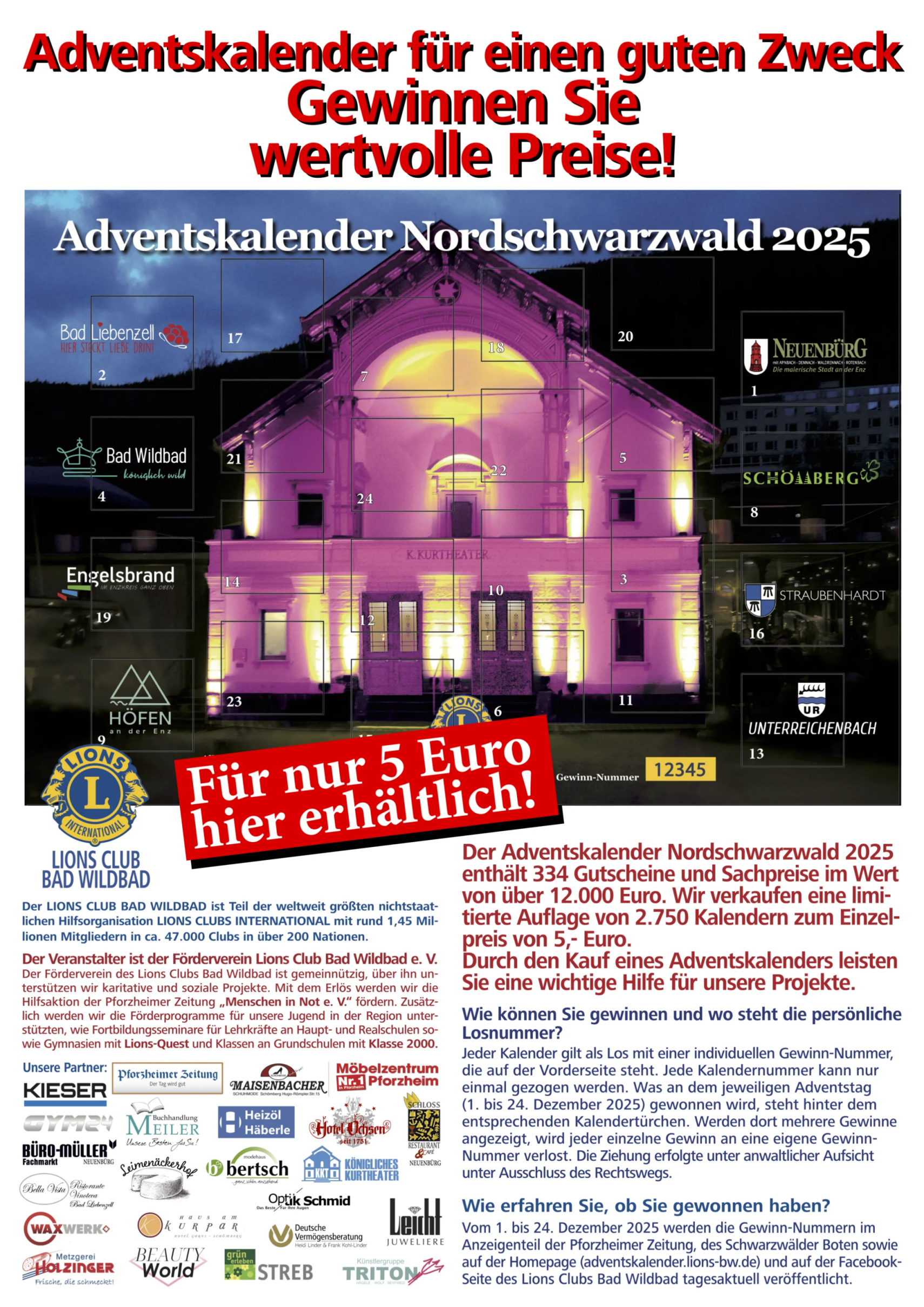 Für nur 5 Euro hier erhältlich! Adventskalender Nordschwarzwald 2025.